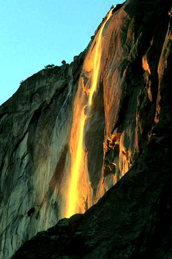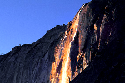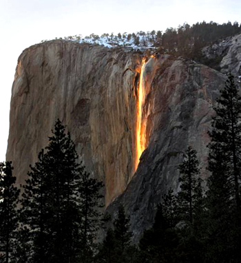 این منظره بدیع تنها در دو هفته آخر ماه فوریه و در یک زمان کوتاه چند روزه ایجاد میشود. به همین دلیل این پارک به “آبشار آتش یوسمیت” Yosemite Firefall نیز معروف است.