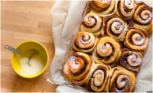فر باید از قبل گرم شده باشد. سینی را در فر با دمای ۱۹۰ درجه سانتیگراد میگذاریم. بعد از ۲۰ تا ۲۵ دقیقه که خمیر طلاییرنگ شد، رول یا نان دارچینی آماده است. ده دقیقه صبر میکنیم تا خنک شود. بعضی روی آن پپودر نارگیل و ودر قند هم میپاشند. من آن را با همان میزان شیرینی داخل خمیر ترجیح میدهم اما در نسخه اصلی، یک شهد شیرین دیگر برای رویش آماده میکنند که روش درستکردنش این است: