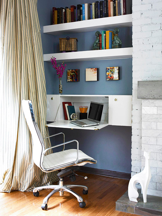 دیوار فرورفته خانه را به محل کار خود تبدیل کنید. در قسمت بالا طاقچه بزنید و پایین کمدی با میز کشویی به دیوار نصب کنید. هنگام کار کافی است سراغ کمد بروید، در را باز کنید، و کشو را بیرون بکشید. یک میز کار آماده در خدمت شما است.